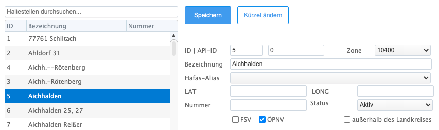 - In der Liste auf der linken Seite finden Sich alle im System sich befindenen Haltestellen alphabetisch geordnet.