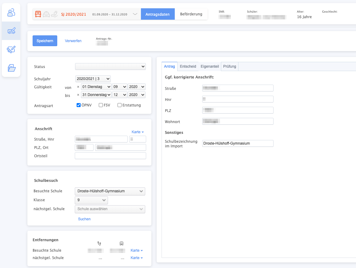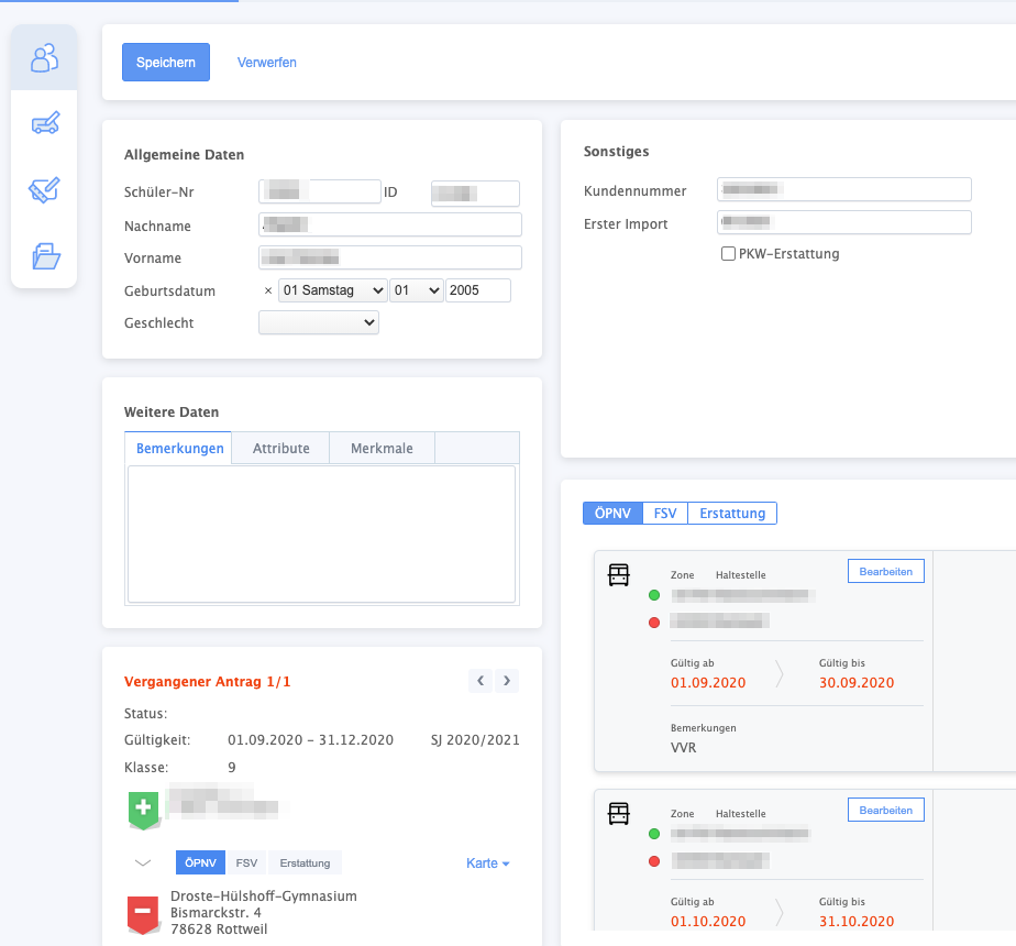 - Hier finden Sie Informationen über das Schuljahr, die aktuelle Gültigkeit des Antrags (diese sollte nicht verändert werden, dies geschieht bei den monatlichen Imports) sowie die Antragsart, alle Schüler im Listenverfahren sind ÖPNV-Schüler. Hieran brauchen Sie auch nichts verändern.